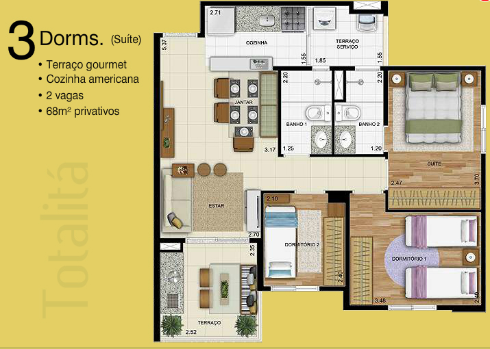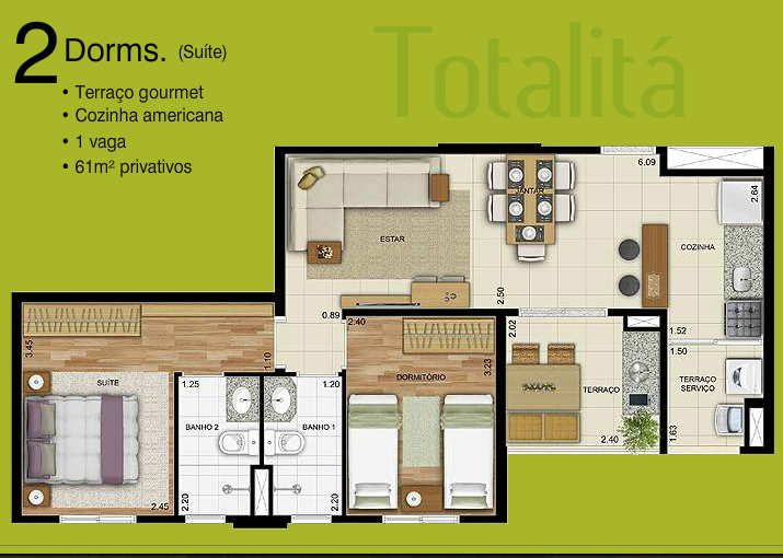 Apartamentos com 57, 61 e 68 m² de área privativa